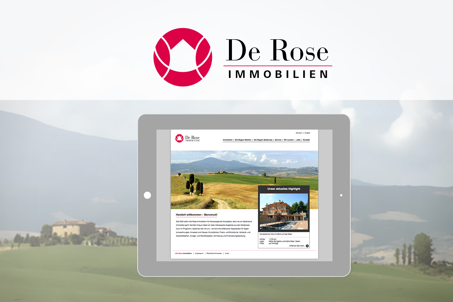 Für die Wort-/Bildmarke wurden Darstellungen von Haus und Rose abstrahiert und kombiniert, so dass eine geschlossene, starke Bildwirkung entsteht. »De Rose«, in dem Schiftklassiker Bodoni ge-