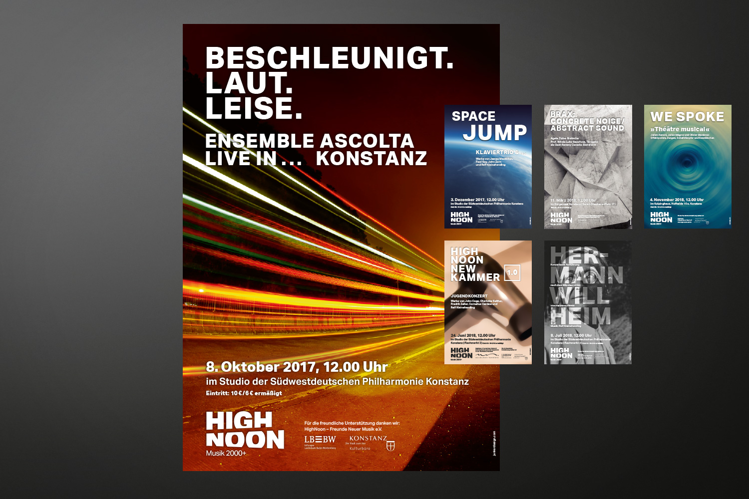 »High Noon Musik 2000+« präsentiert zeitgenössische Kammermusik in einem regelmäßig wiederkehrenden Rahmen. Darüber hinaus stellt das Format ein Experimentierfeld für professionelle Musiker des Bodenseeraumes dar. Entwicklung, des Logos, der Plakate zur Konzertreihe sowie der Website www.highnoonmusik.de