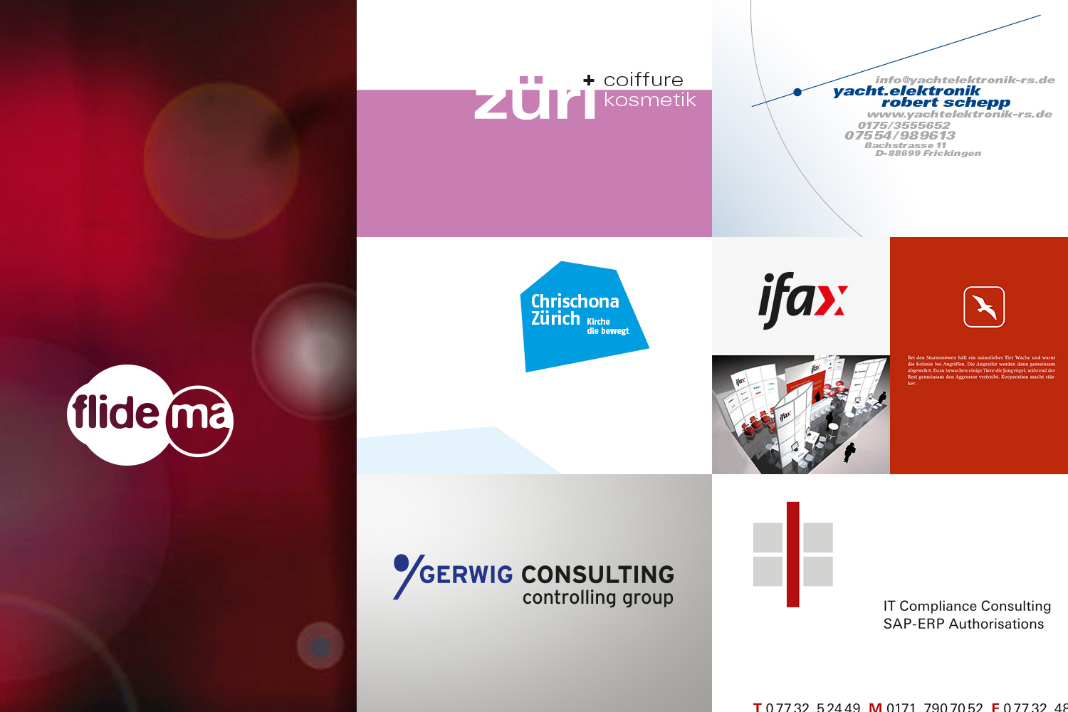 Eine Auswahl verschiedener Projekte, die meist das Spektrum Erscheinungsbild, Internet und teilweise sogar Messestand abdecken. Immer geprägt von einem konzeptionellen Ansatz, der inhaltliche Auseinandersetzung und visuelle Umsetzung adäquat verbindet.